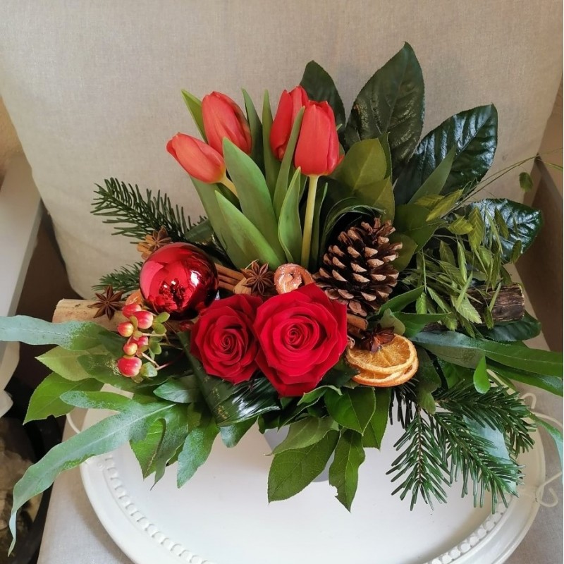 Composition : roses, tulipes, fleurettes et verdures